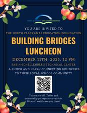 Our second annual Building Bridges Luncheon is Thursday, December 11th, 12 pm at the Sabin-Schellenberg Technical Center and you are invited! This lunch-and-learn focuses on connecting our local business leaders with the North Clackamas school community. As a business owner, we’d love for you to attend to hear about the programs NCEF makes possible, many focused on helping shape the next wave of students entering the workforce. Attending is a great way to learn about new programs, network with other local businesses, and enjoy a delicious meal prepared by Sabin Schellenberg culinary students.
